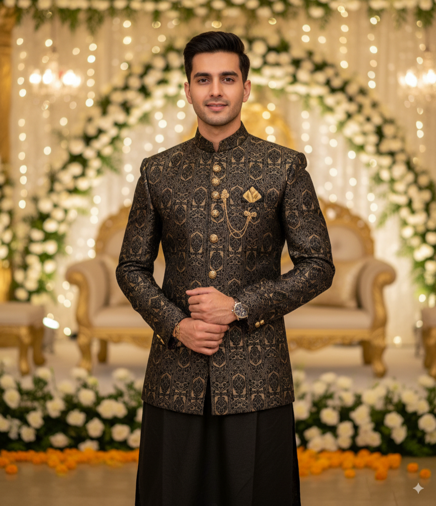 Black Golden Hand Work Prince Coat & Black Sequence Kurta Pajama