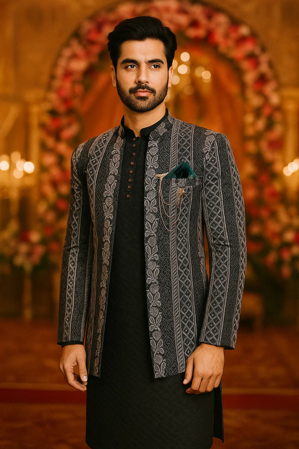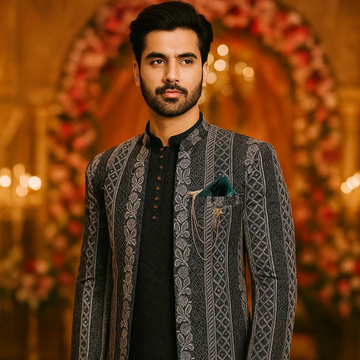 Grey Jamawar Flower Style Prince Coat & Black Sequence Kurta Pajama
