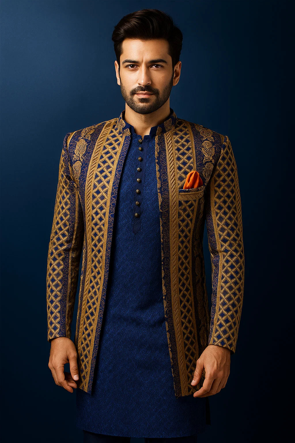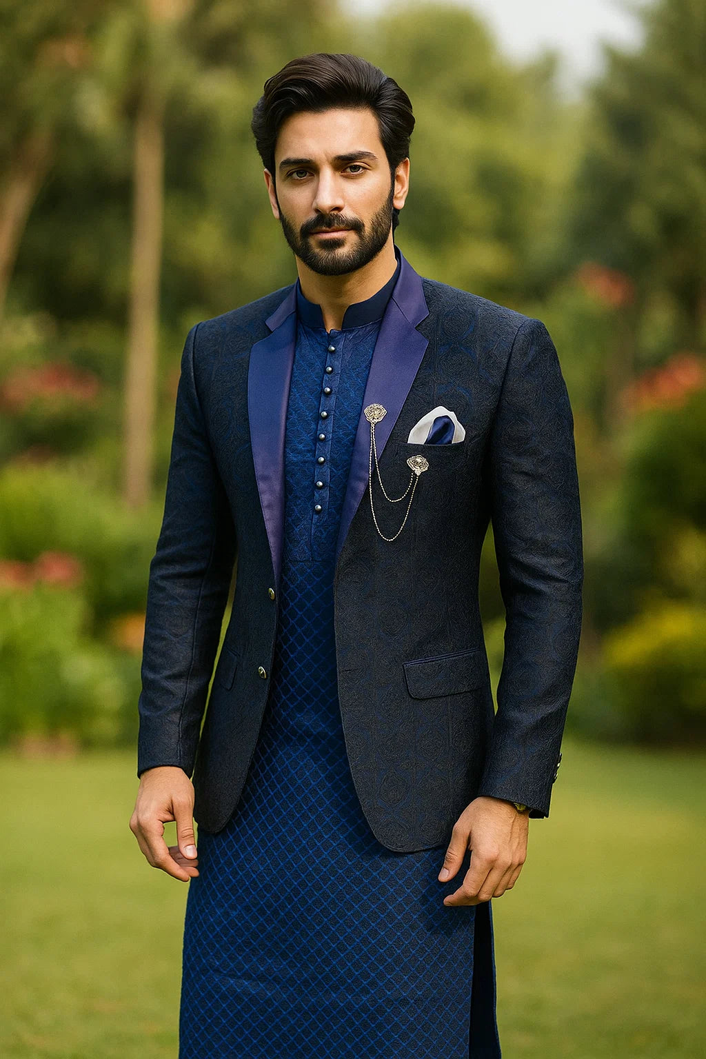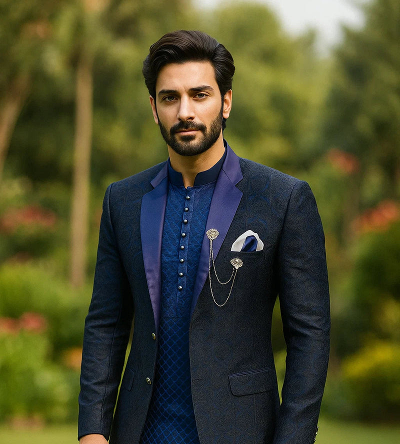 Navy Blue Border Style Prince Coat & Sequence Blue Kurta pajama