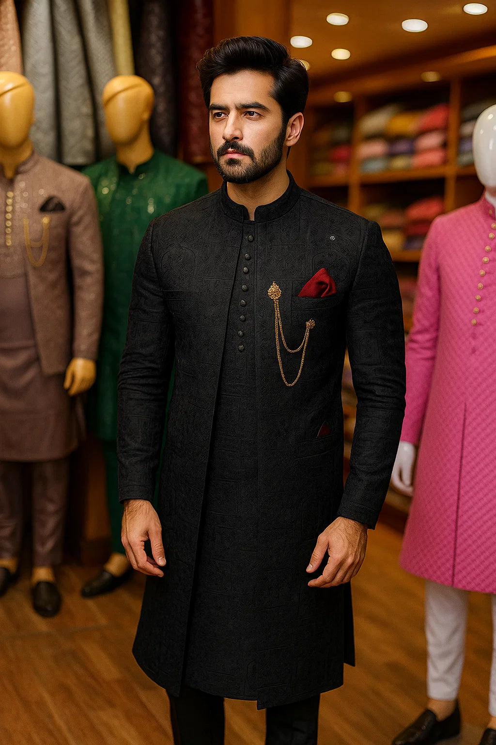 Black Golden Hand Work Prince Coat & Black Sequence Kurta Pajama