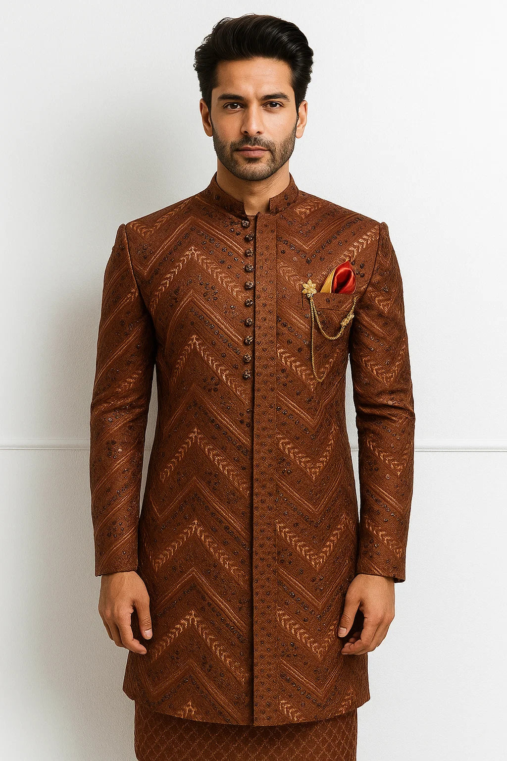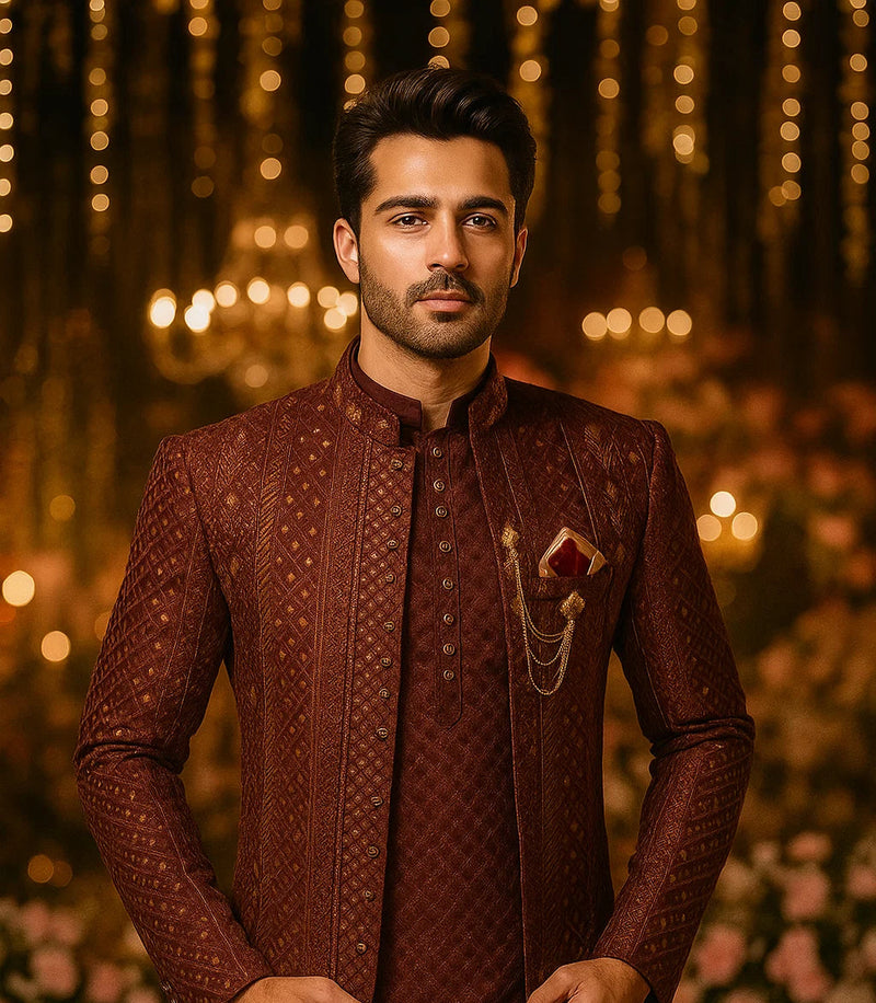 Chocolate Brown Border Style Prince Coat & Sequence Kurta Pajama
