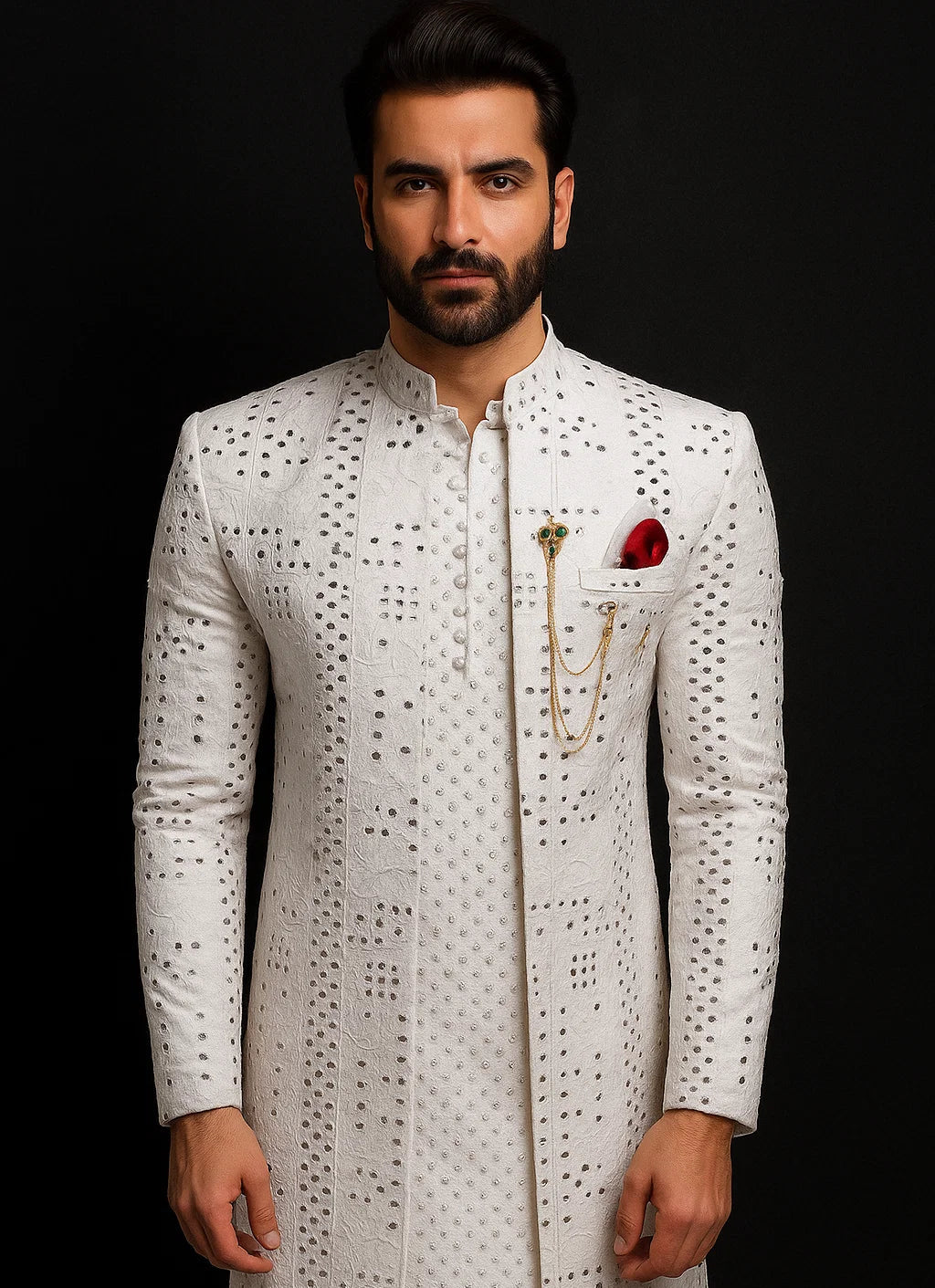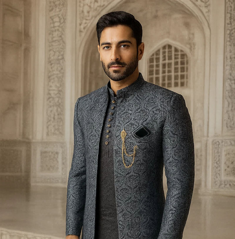Matching Grey Wave Style Sequence Work Prince Coat & Kurta Pajama