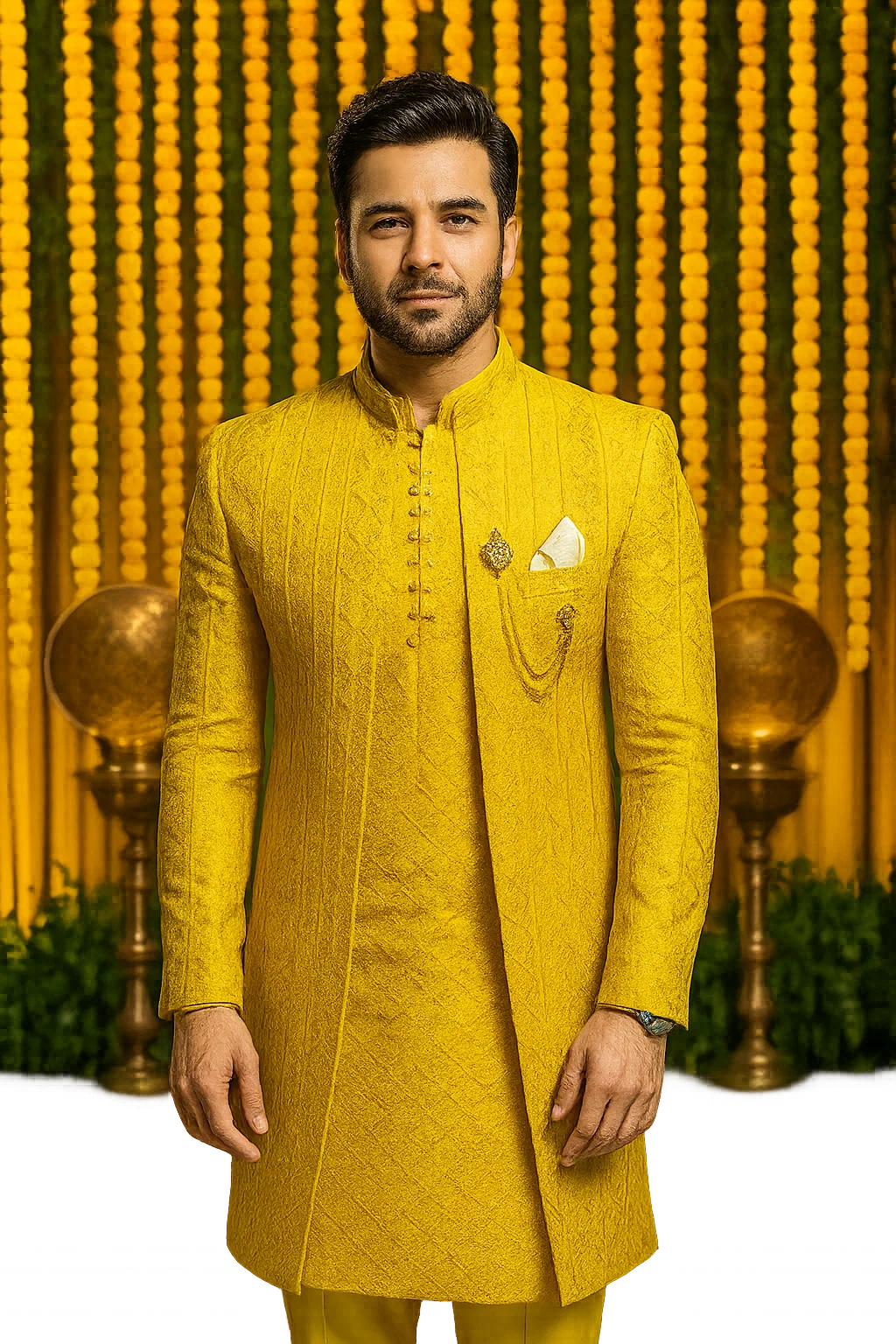 Golden Black Jamawar Casual Coat & Simple Golden Kurta Pajama