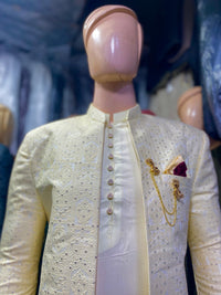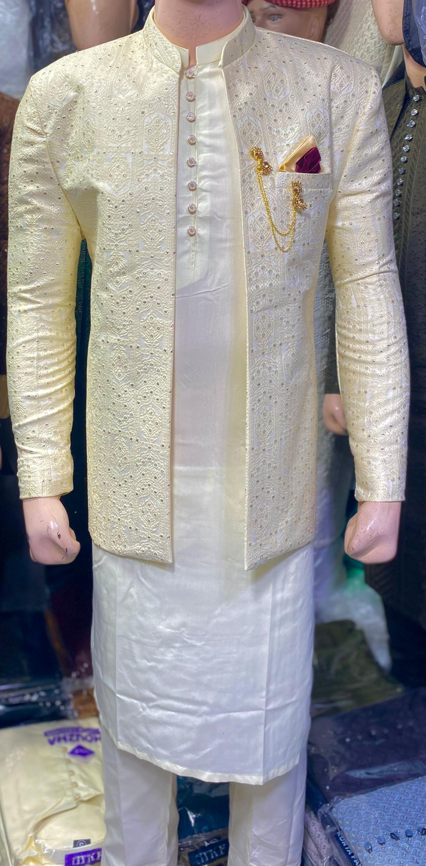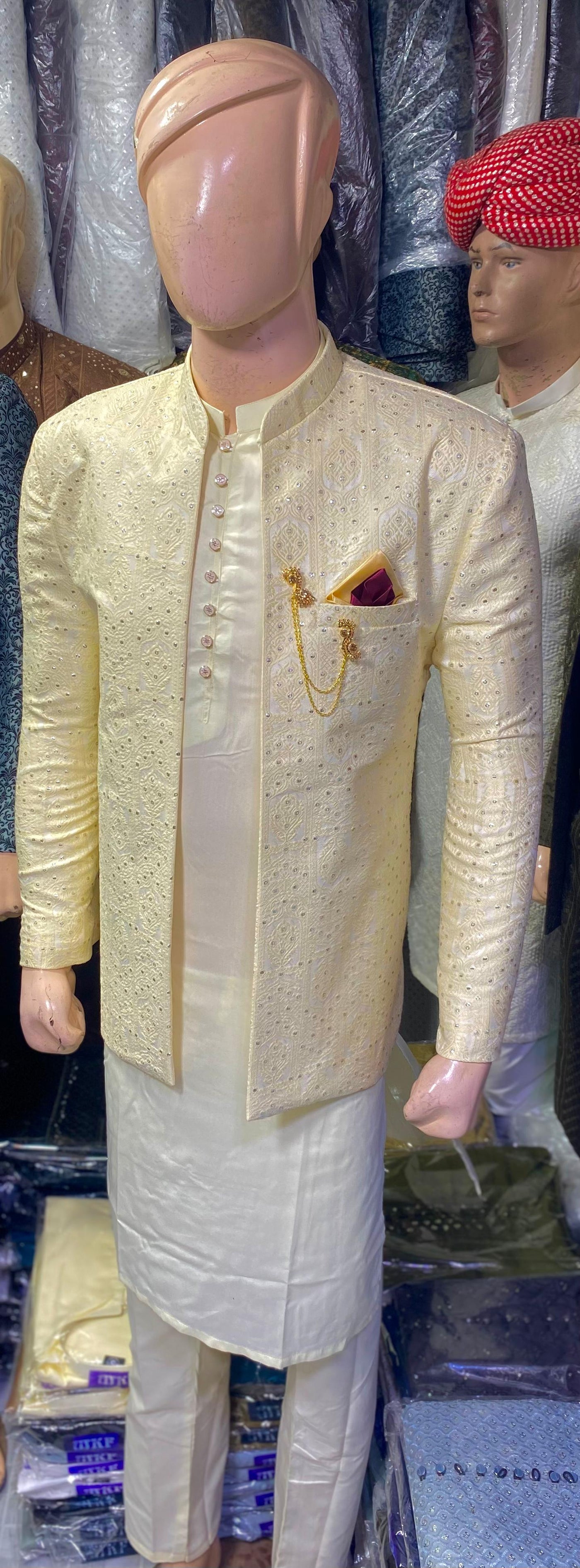 Cream Jamawar Window Style Prince Coat & Simple Cream Kurta Pajama - S