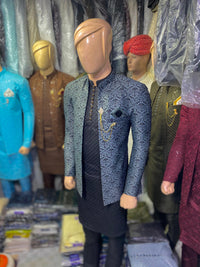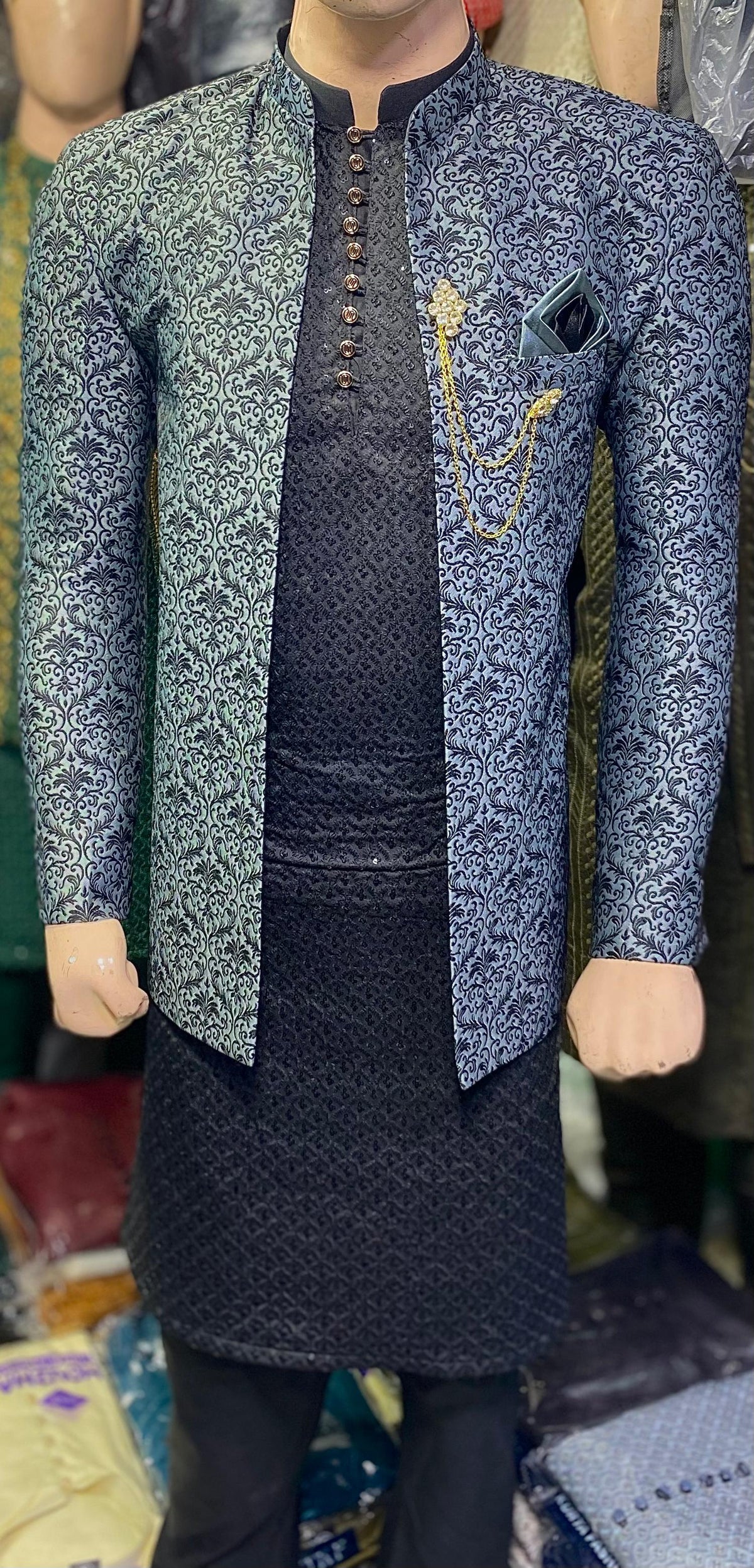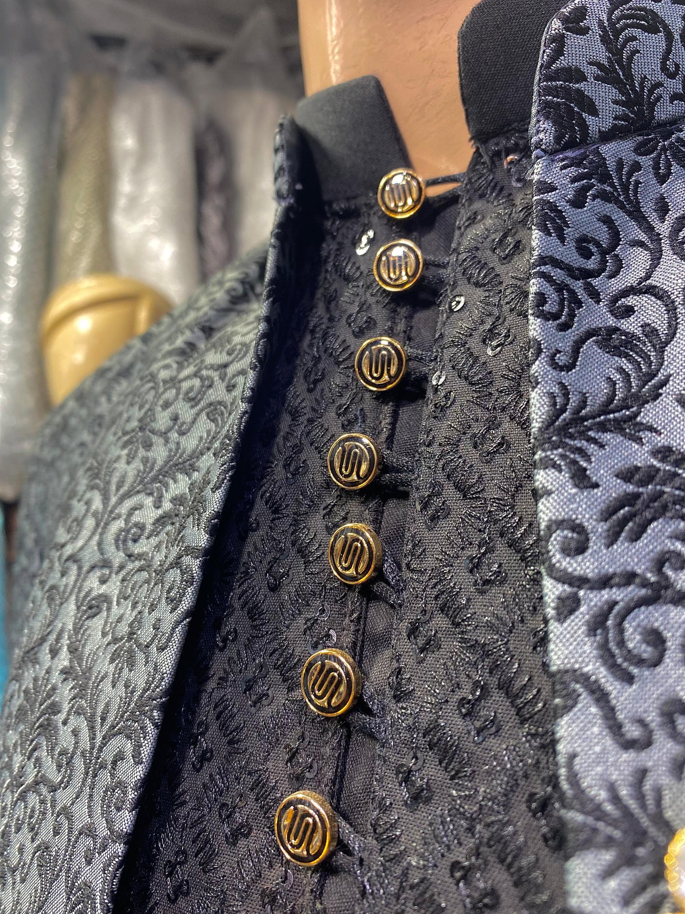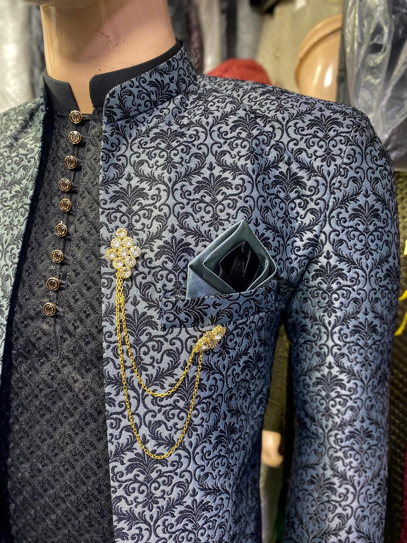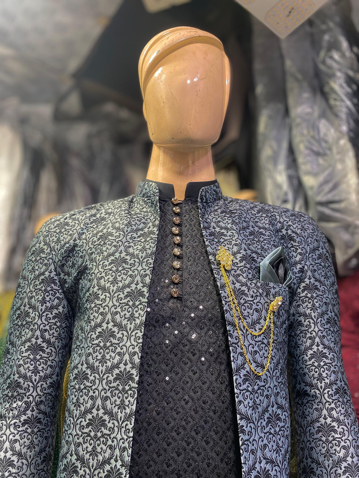 Grey Jamawar Flower Style Prince Coat & Black Sequence Kurta Pajama - S