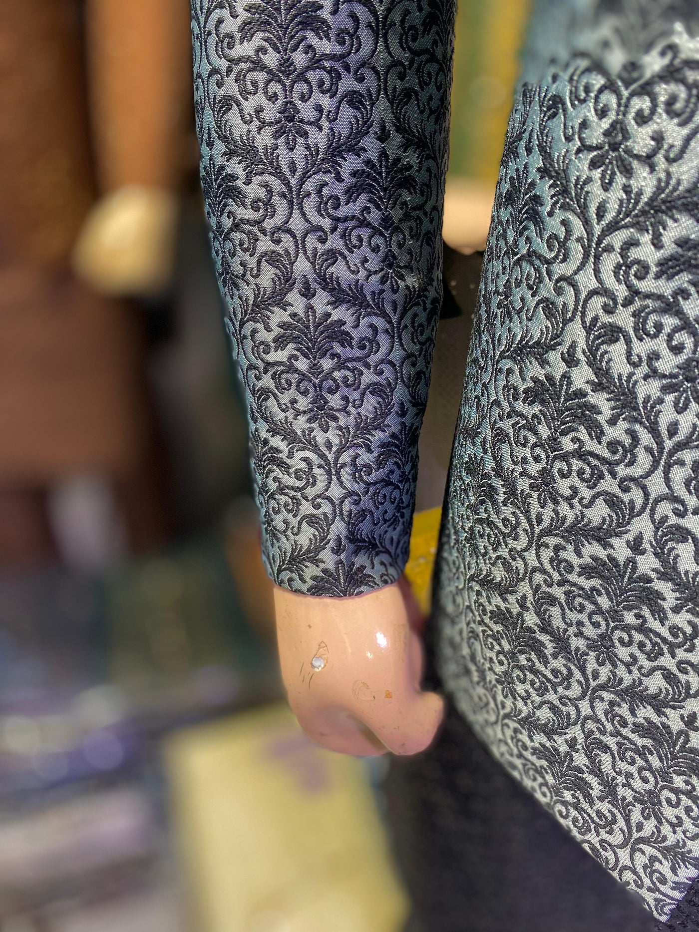 Grey Jamawar Flower Style Prince Coat & Black Sequence Kurta Pajama