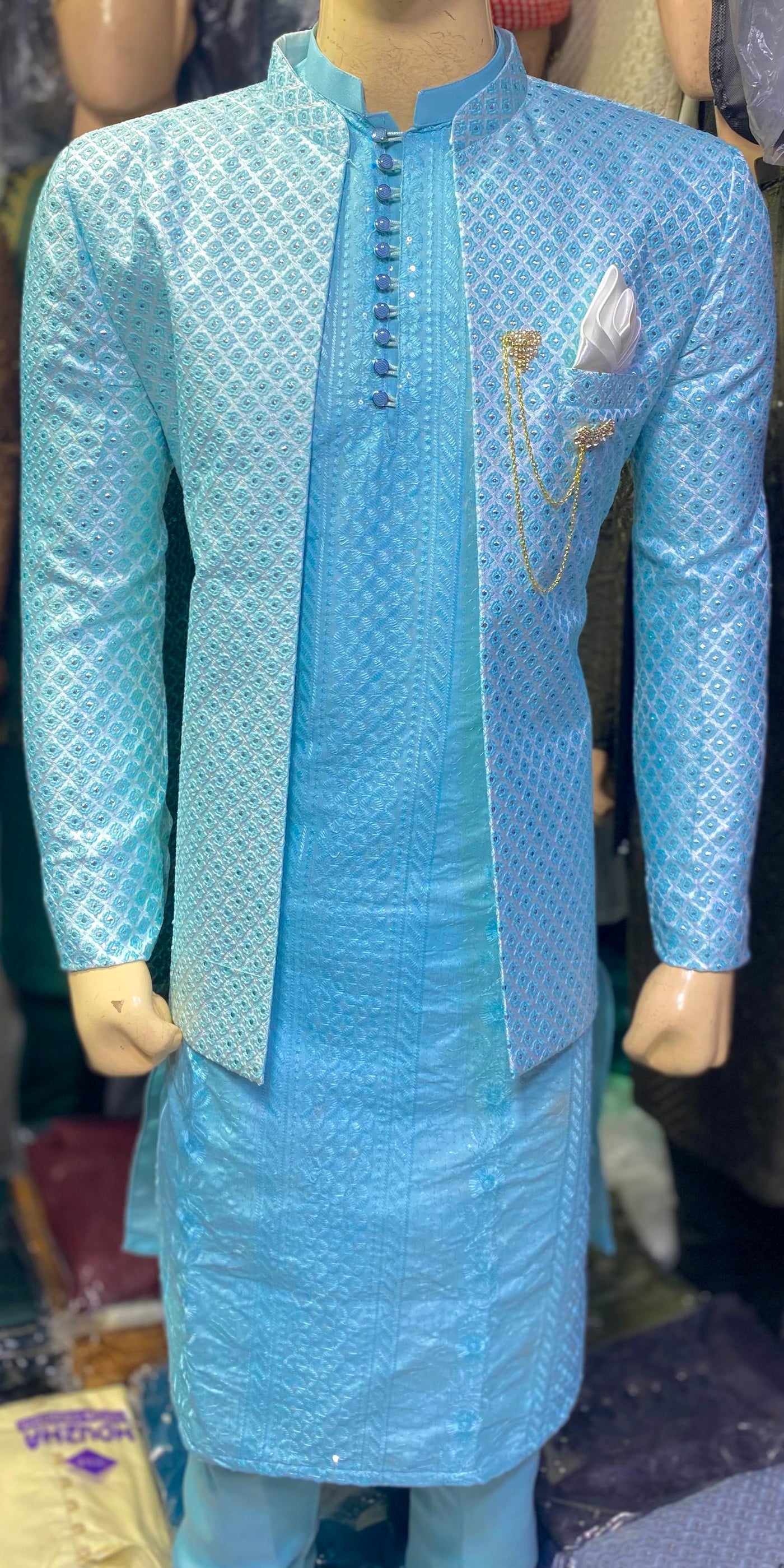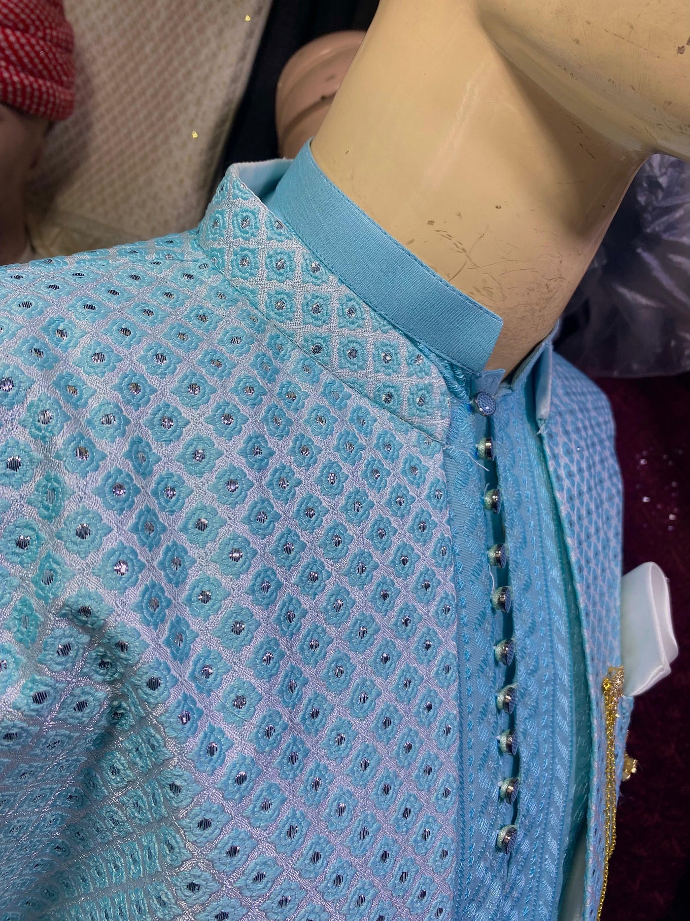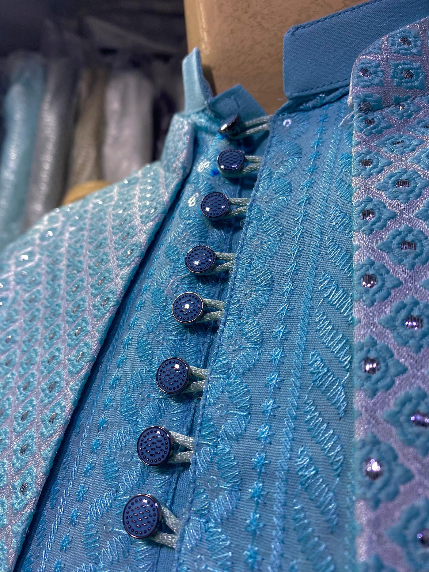 Light Ferozi Jamawar Style Prince Coat & Sequence Work Kurta Pajama
