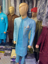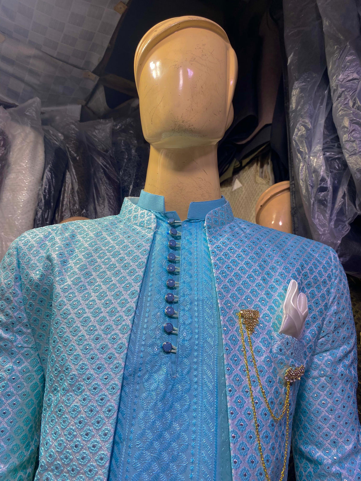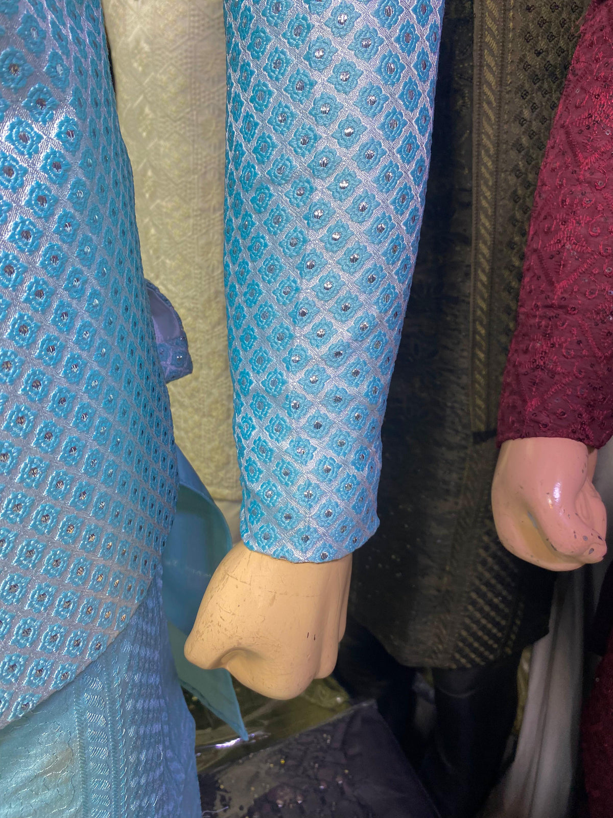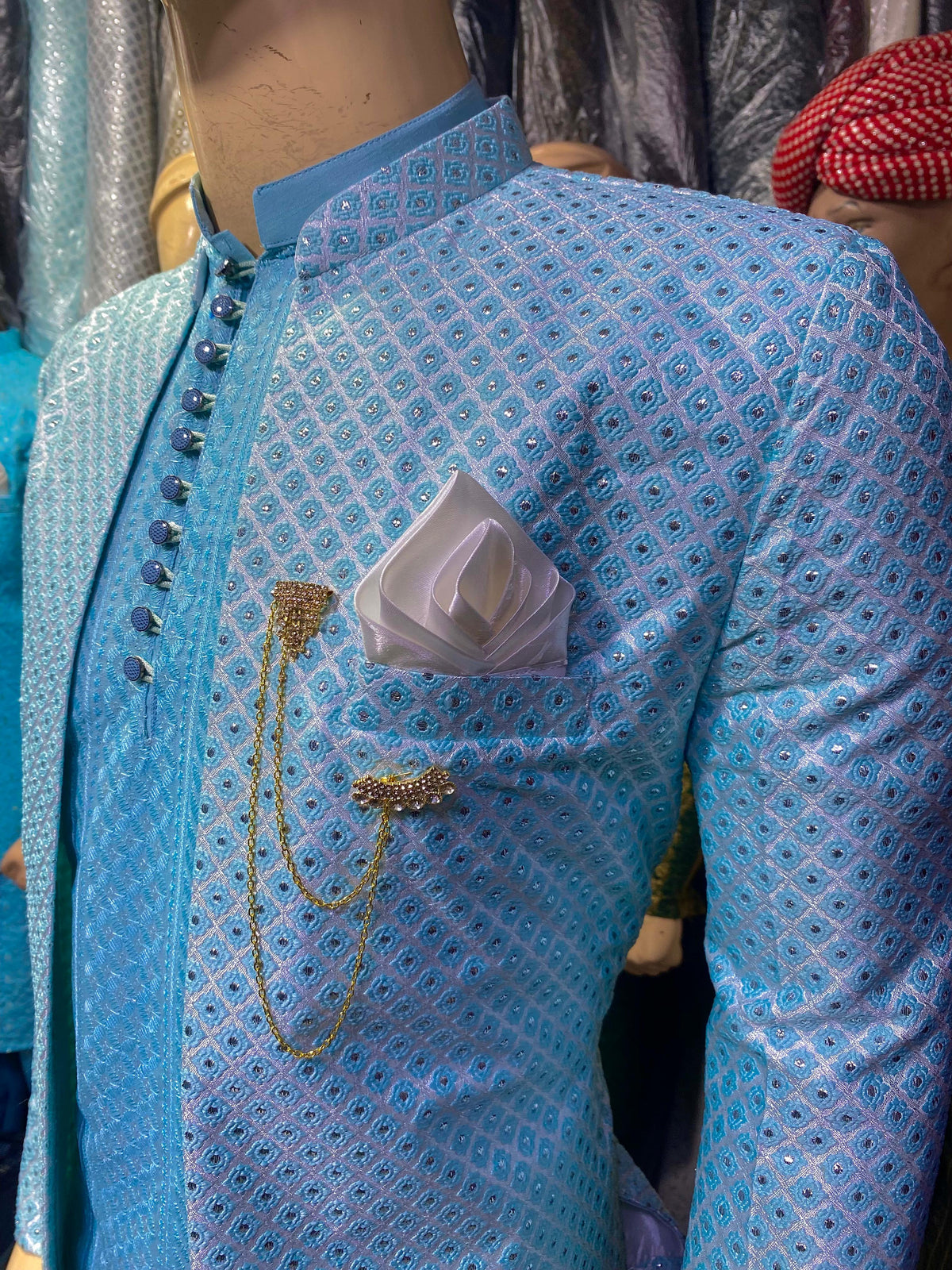 Light Ferozi Jamawar Style Prince Coat & Sequence Work Kurta Pajama - S